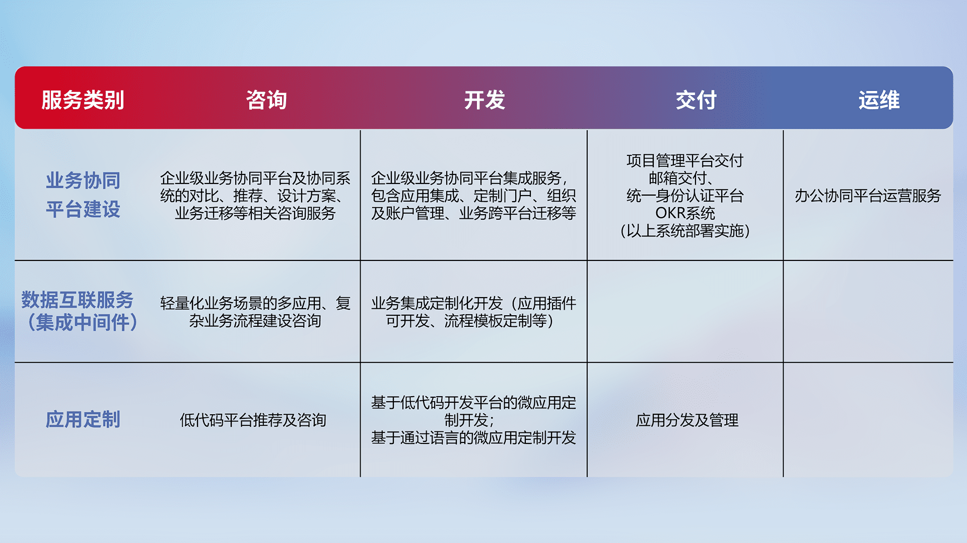 针对钉钉、、、企微、、、、IDaas等平台级产品提供产品的规划、、方案、、、、交付、、、定制化开发等服务,,,,实现如统一协同办公、、、智能客户服务、、混合会议管理、、智能数据查询、、、、等业务场景,,,,实现数字化转型。。。